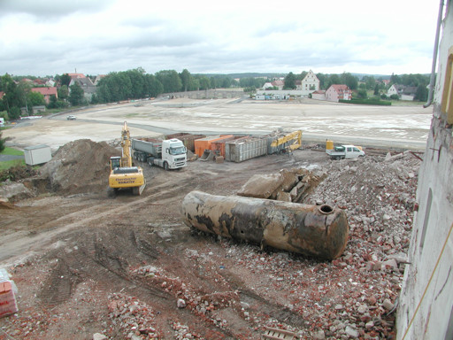 Tankbergung, unterhalb des Tanks kam ein Ölschaden bis in den geklüfteten Fels (über 9 m Tiefe) zum Vorschein. Im Hintergrund das Fischerschlößchen und die steinerne Brücke sowie die geplante Seenlandschaft.