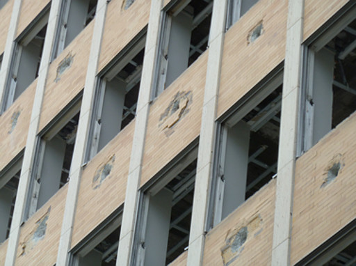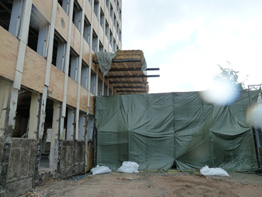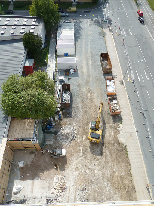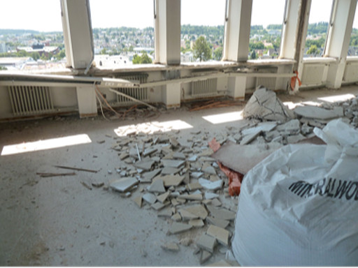 Das zehngeschossige Zentraljustizgebäude in Hof wurde in den Jahren 1959-1961 errichtet. Das Bauwerk wurde in Stahlbetonskelettbauweise mit Ausfachungen aus Stahlbetonfertigteilbrüstungen mit angemörtelten Spaltklinkerplatten errichtet. Im Bereich der Betonstützen befinden sich vorgehängte Travertinplatten auf einer hinterlüfteten Konstruktion. Die ursprünglich vorhandenen Einfachverglasungen der Fenster in einem Holz-Aluminum-Rahmenprofil wurden in den 90er Jahren durch Isolierverglasungen ersetzt. Im Vorfeld der Abbruchplanung und der Ausschreibung wurde eine Schadstofferhebung des Gebäudes durchgeführt. Darauf aufbauend wurden dann die Dekontaminationsverfahren, die möglichen Entsorgungswege und die erforderlichen Arbeits- und Immissionsschutzmaßnahmen aufgezeigt.