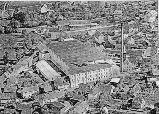 Foto 01: Ehemalige Weberei Weber & Ott um 1955 in Vogelperspektive (Blickrichtung W-O (Quelle: Schreyer, 2000: Brand – Ein Ort im Wandel der Zeit).